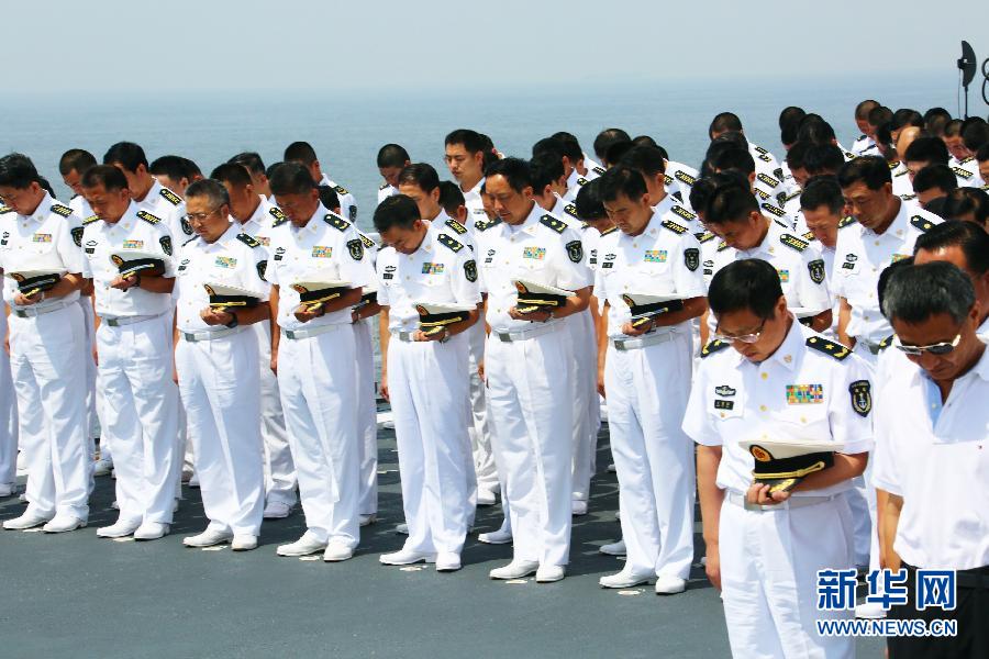 8月27日,汽笛长鸣,参加祭奠仪式的军地领导和官兵代表脱帽低头默哀1分钟。当日,海军在威海刘公岛海域举行甲午战争120周年海上祭奠仪式。由导弹护卫舰盐城舰、临沂舰、大同舰和1艘综合保障船及2架舰载直升机组成的海空编队,分别向预定海域航渡。官兵在甲板分区列队,在军地领导和官兵代表嘹亮的国歌声中,海上祭奠仪式开始。同一时刻,万里海疆军港内的舰艇齐声鸣笛,祭奠在甲午战争中为国捐躯的北洋海军将士。新华社记者查春明摄