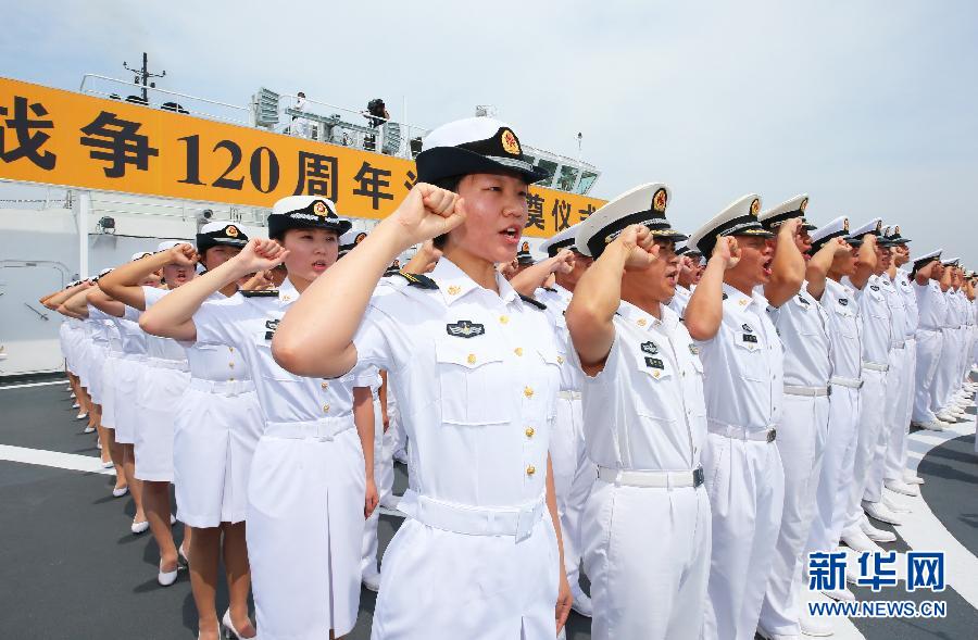 8月27日,海军官兵代表在海上祭奠仪式上庄严宣誓。当日,海军在威海刘公岛海域举行甲午战争120周年海上祭奠仪式。由导弹护卫舰盐城舰、临沂舰、大同舰和1艘综合保障船及2架舰载直升机组成的海空编队,分别向预定海域航渡。官兵在甲板分区列队,在军地领导和官兵代表嘹亮的国歌声中,海上祭奠仪式开始。同一时刻,万里海疆军港内的舰艇齐声鸣笛,祭奠在甲午战争中为国捐躯的北洋海军将士。新华社记者查春明摄
